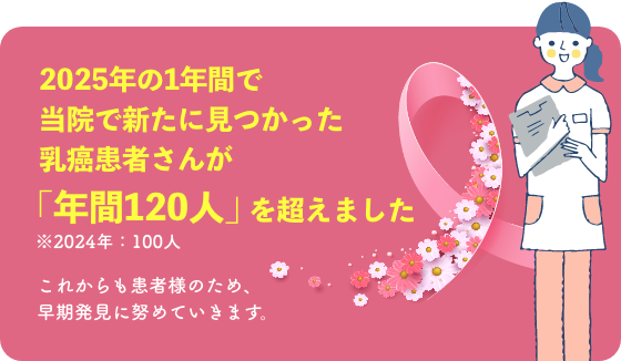 年間200件以上の乳腺疾患の診断、手術に携わってきた乳腺専門医である院長が診察・診療を行い、お一人お一人のライフスタイルに合わせた乳がん治療を行います。再発予防についてもお任せください。